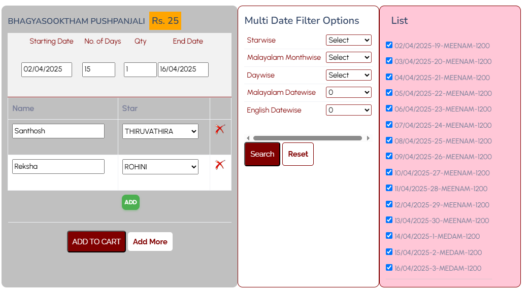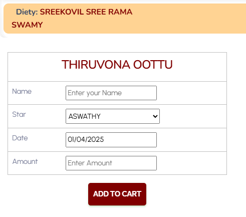 തുടർന്ന് വരുന്ന സ്ക്രീനിൽ പേര്, ജന്മ നക്ഷത്രം, തീയതി, തുക എന്നിവ നൽകി ബട്ടൺ ക്ലിക്ക് ചെയ്യുക.