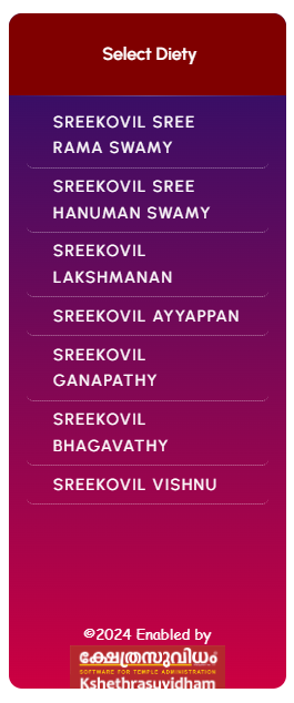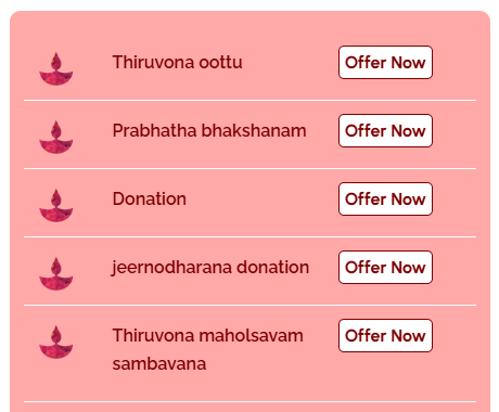 മെനു ബാറിൽ നിന്നും ക്ലിക്ക് ചെയ്യുക. അപ്പോൾ വഴിപാടുകൾ വിവരങ്ങൾ അടങ്ങുന്ന പേജ് കാണാൻ സാധിക്കുന്നതാണ്.